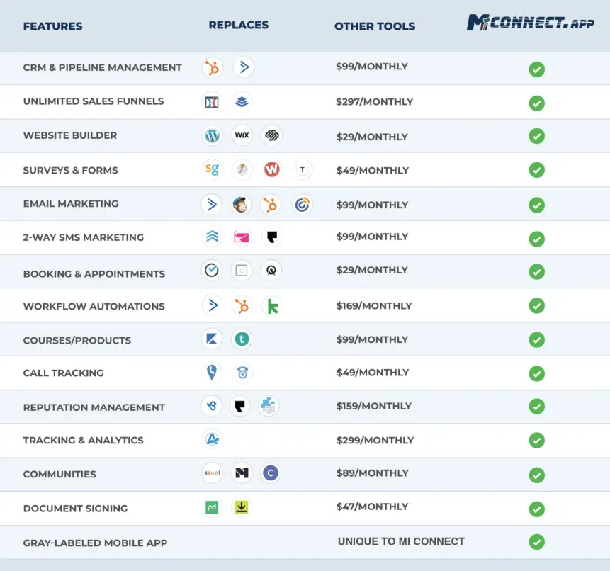 Instead of having to subscribe to multiple services, you can use MiConnect for it all. Our platform includes a robust yet easy to use CRM, Sales Funnel, and Pipeline Management system. Easily execute email and SMS campaigns, set appointments and automate workflows. Migrate your website to MiConnect or simply use our unlimited sites, landing pages, and forms for specific campaigns. But best of all, you get unlimited users - no more 'per seat' pricing!